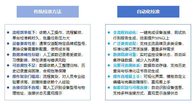 全程自动,效率跃升:从设备连接、测试执行到报告生成,全程一键自动化完成。无需人工逐步操作,校准周期大幅缩短,效率较传统人工方式提升超50%,尤其适合批量校准任务。
